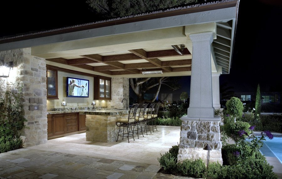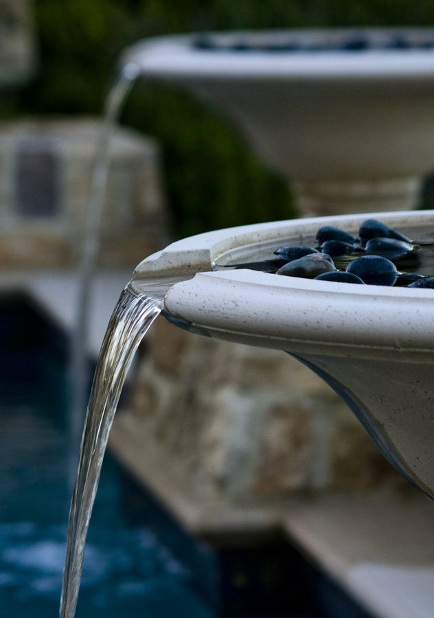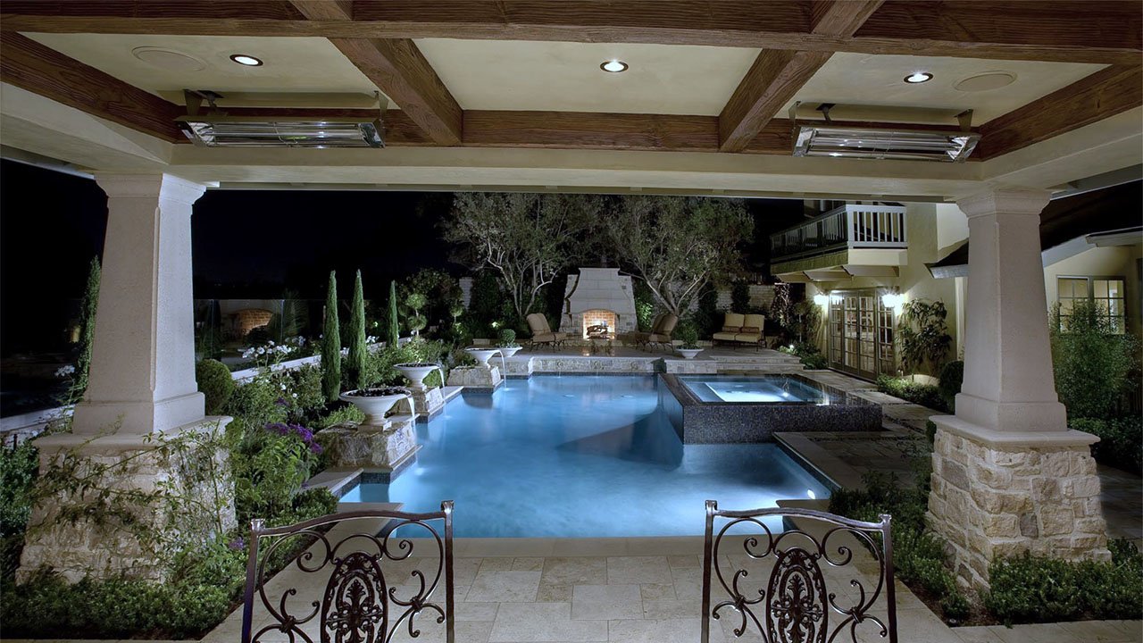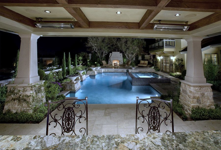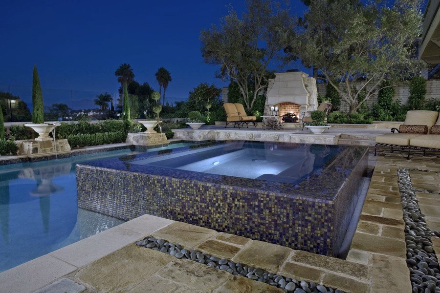 This timeless backyard features a beautifully tiled swimming pool with a graceful fountain and natural rock walls. Marble tables add a touch of elegance and sophistication to the outdoor space. The design blends classic materials and textures to create a refined and inviting atmosphere.