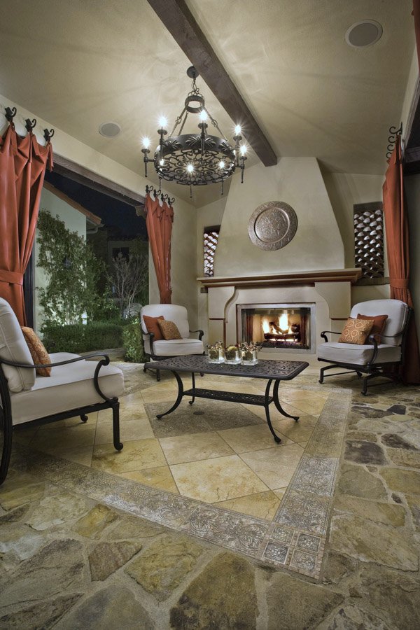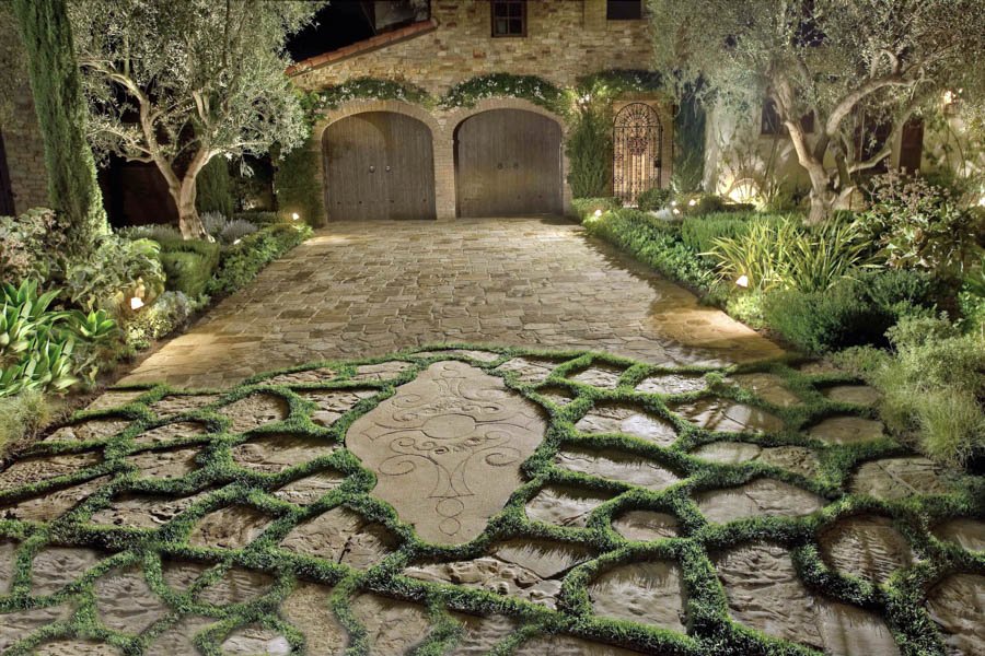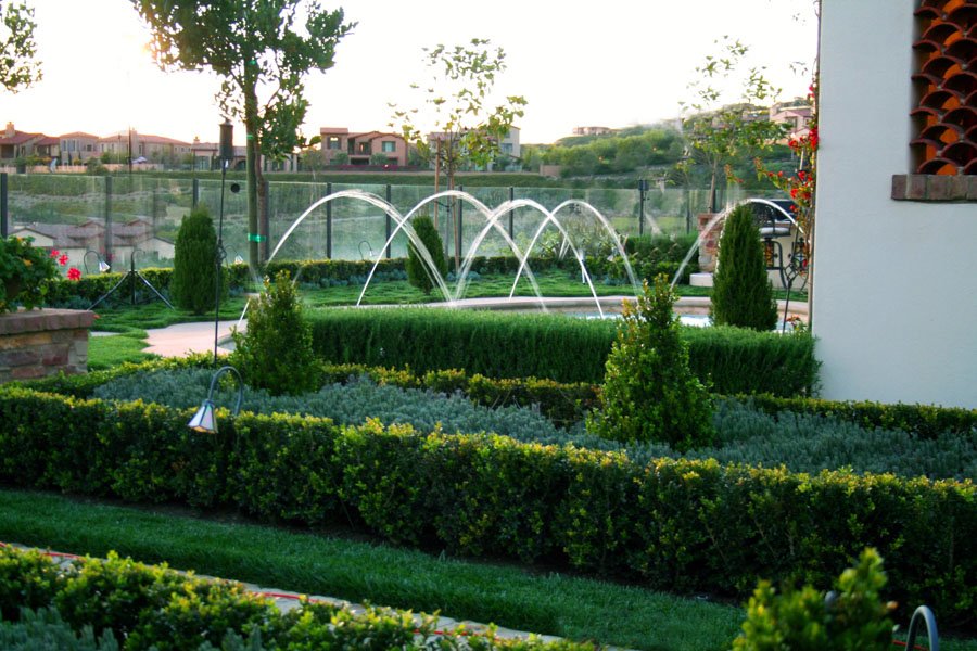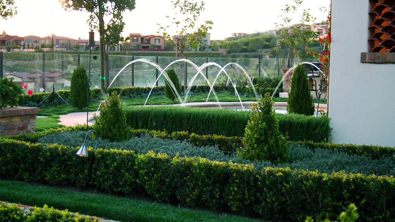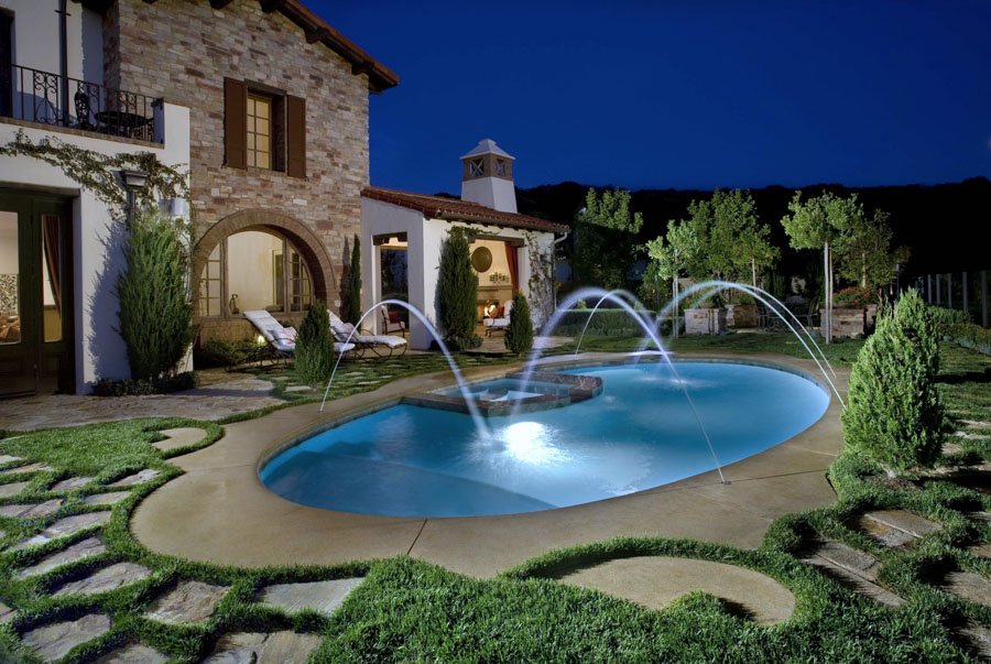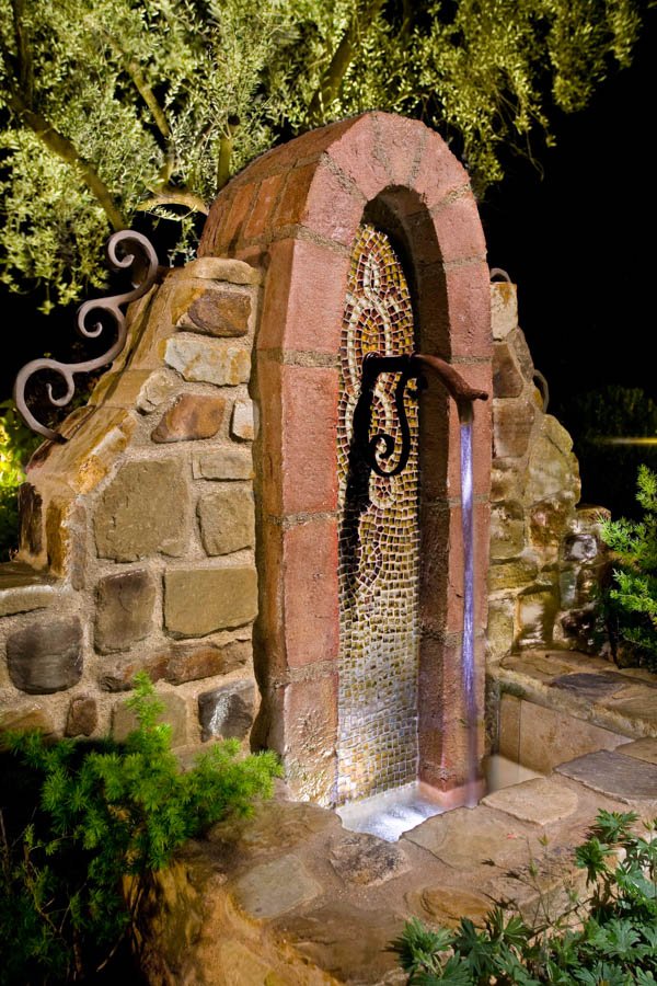 This project features unique wall and floor textures that add depth and character to the outdoor space. An oval-shaped pool, paired with a fountain, creates a relaxing focal point. Accent lighting tucked into the greenery brings the landscape to life in the evening, offering a warm and inviting atmosphere.